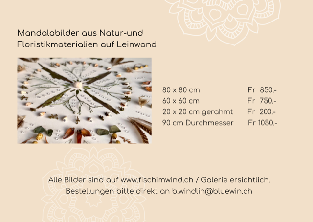 Bis heute ist sie ihren Mandalas treu geblieben und hat sie weiterentwickelt zu Natur-und Floristikmandalas. Diese Naturgegenstände werden liebevoll auf der Leinwand angeordnet und einzeln mit Leim aufgeklebt.